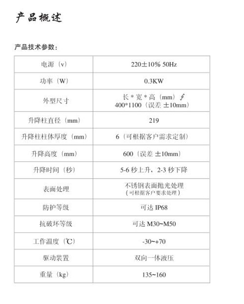 路障升降柱主要由路障升降柱體、氣缸、導向軸、封蓋、外箱、鎖等部分組成。升降體:采用304國標不銹鋼8mm/6mm厚鋼管加工形成,具有高強度的承重和抗撞能力;柱體內無電器、線路設置,防水、安全。
